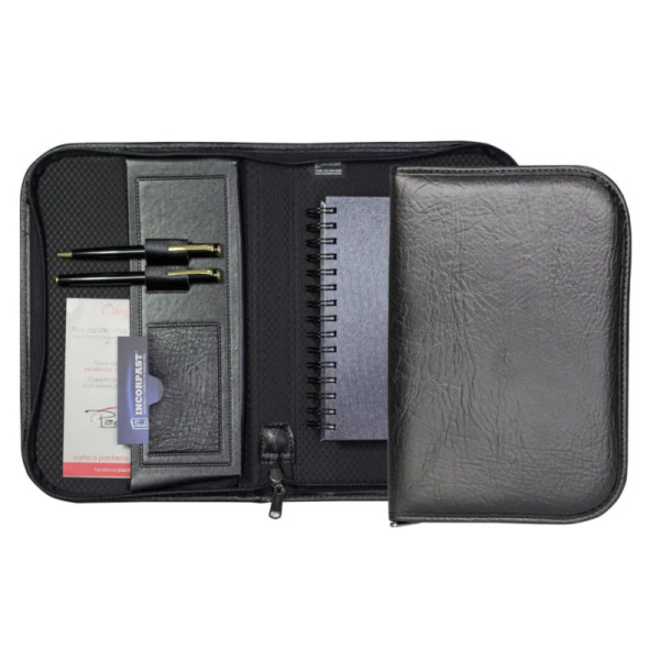 A Pasta Universitária Média Incorpast foi desenvolvida para facilitar o transporte de blocos, agendas, cadernos e etc. Fabricada em Couro Sintético de primeira linha a Pasta Universitária Média Incorpast possui 2 porta canetas, 1 bolsa interno e 1 porta cartão, com fechamento a zíper. Você pode adquirir sua Pasta Universitária Média Incorpast em duas opções de Lombada: 1650 com Lombada de 2,5cm ou 1660 com lombada de 5cm. Personalize sua Logo em baixo relevo ou serigrafia, leve essa facilidade para seus clientes!