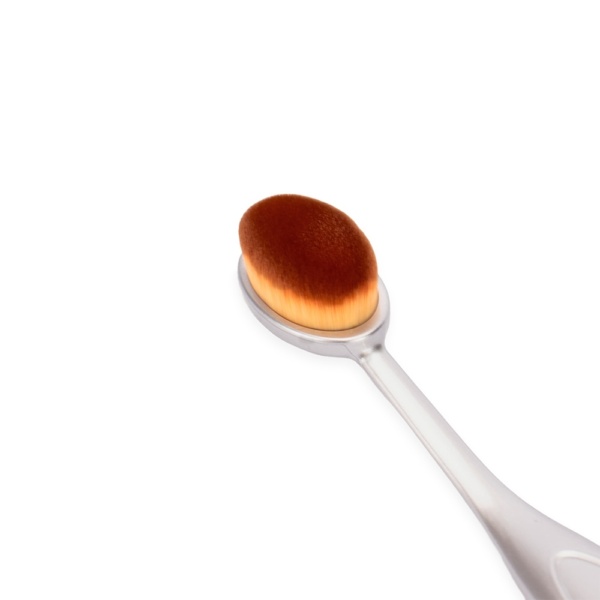 Pincel de maquiagem com design do tipo escova em plástico. Possui cerdas macias dispostas em formato oval, ideal para a aplicação suave de bases líquidas ou em creme.
