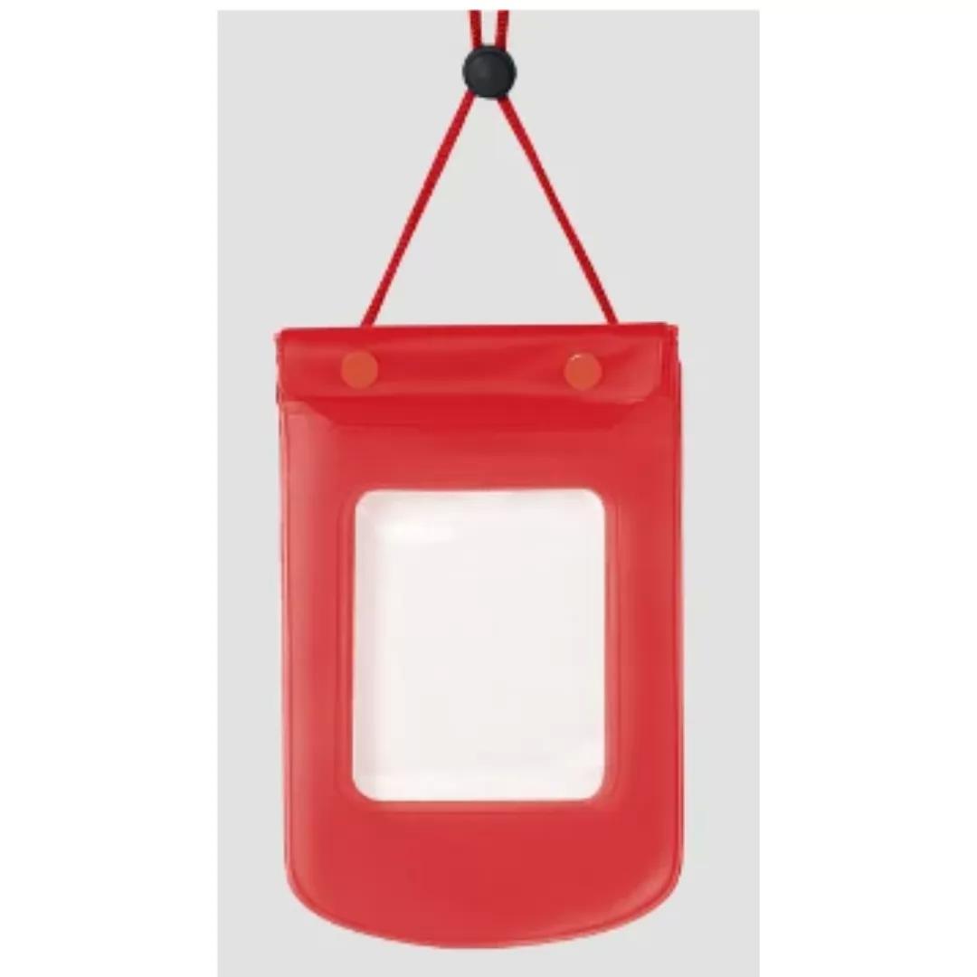 Confeccionado em plástico e cor vermelha, possui cordão para pescoço com regulagem de altura e visor em plástico PVC transparente dos dois lados que permitem o uso do touch-screen. Conta com sistema de proteção contra entrada de água, dobras e dois botões de pressão para fechamento final.