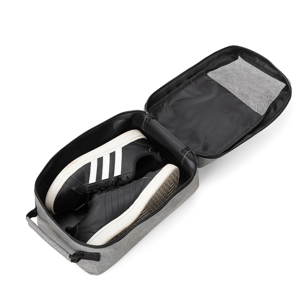 Porta Tênis em tecido poliéster com bolso frontal e alça de mão.
