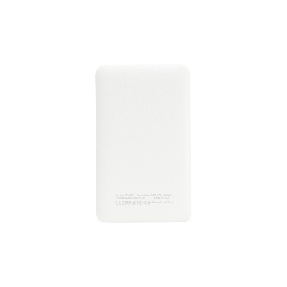 Power bank plástico de 5.000mAh com indicadores led de bateria e cabos acoplados: Lightning e V8. Acompanha cabo USB-V8 e adaptador Tipo-C.