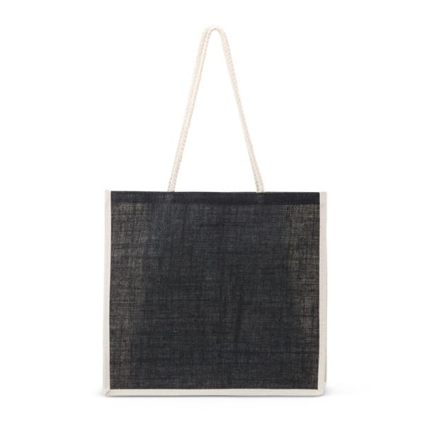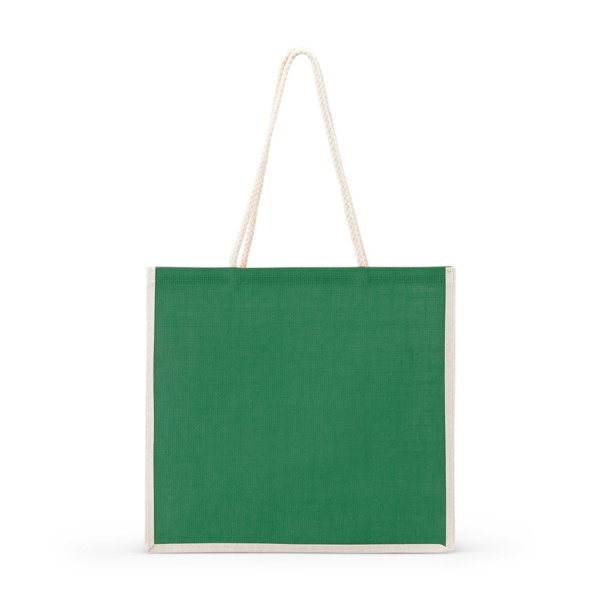 Sacola ecológica confeccionada em juta com alças costuradas na parte interna.