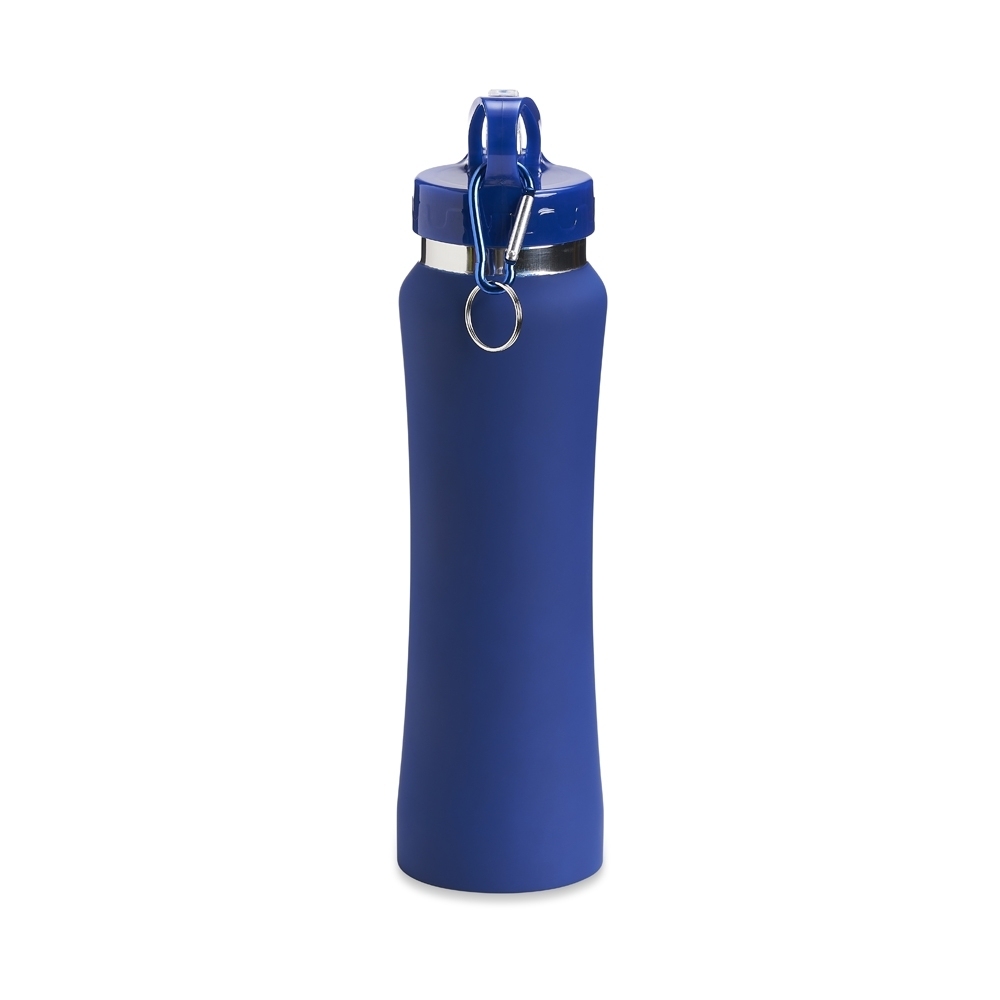 Squeeze de inox com capacidade de 750ml, tampa plástica com bico de canudo. Acompanha mosquetão.