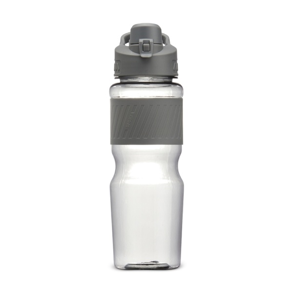 Squeeze plástico 730ml com luva emborrachada, alça para transporte e tampa de proteção com trava para o bocal.