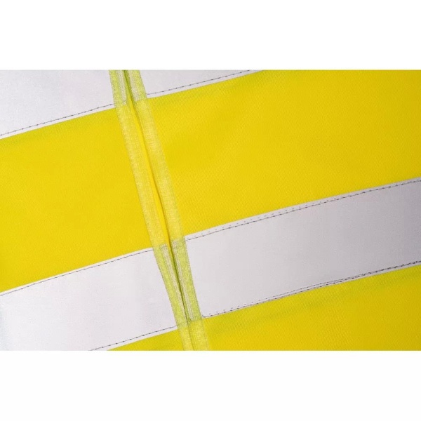 Colete de alta visibilidade em 100% poliéster com certificado pela norma EN ISO 20471 classe 2. Colete refletivo com 2 bandas refletoras horizontais e abertura frontal com fecho de velcro. Tamanho único: 670 x 700 mm